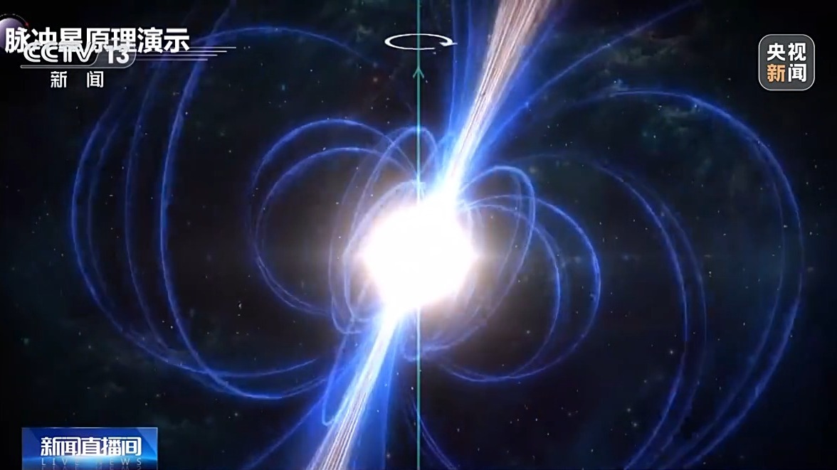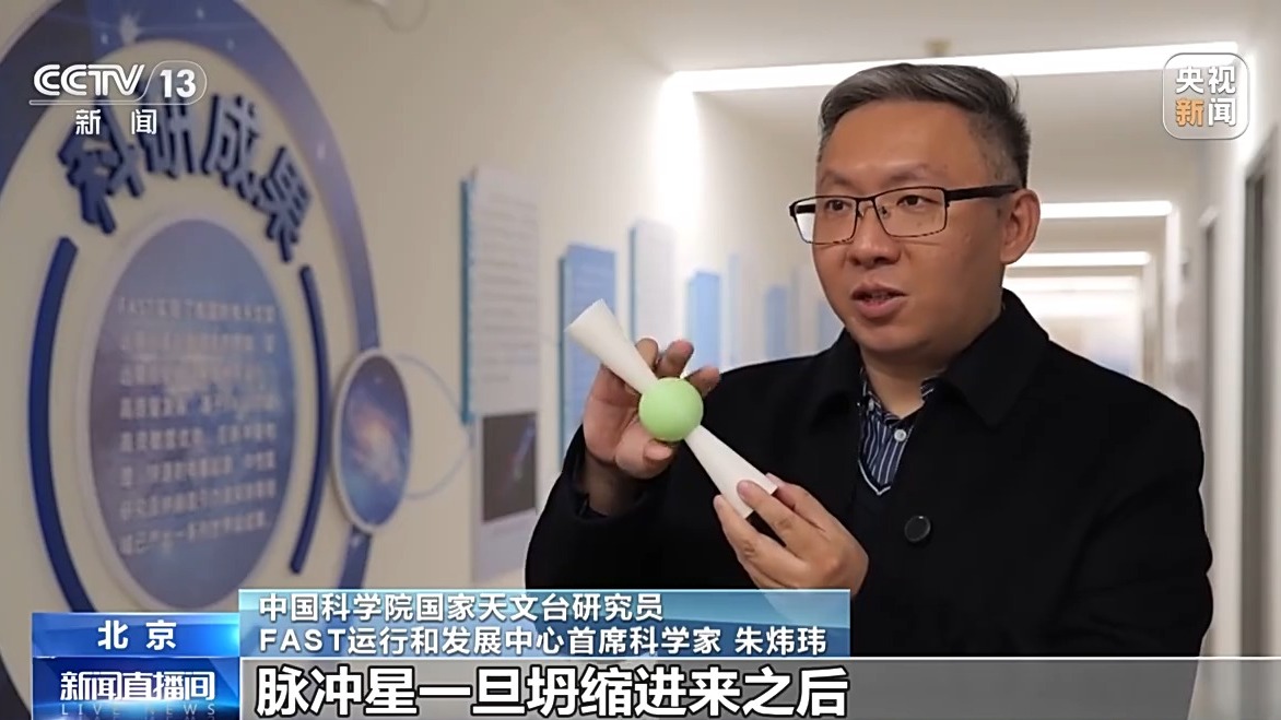 *中國科學院國家天文台研究員 FAST運行和發展中心首席科學家 朱煒瑋:*比方説,這是一個脈衝星模型,脈衝星一旦坍縮進來之後,它的質量仍然有比太陽還大的質量,但它的半徑只有10公里左右。它有巨大的密度,它的密度之大、壓力之大,它的核心的密度已經超過了核物質,可以説是把原子核已經壓碎了,所以在這麼一種極端的天體裏面,我們通過研究它,就可以幫助我們理解在極高密度下粒子物理的基本。它是宇宙中極為獨特的天體物理“實驗室”。