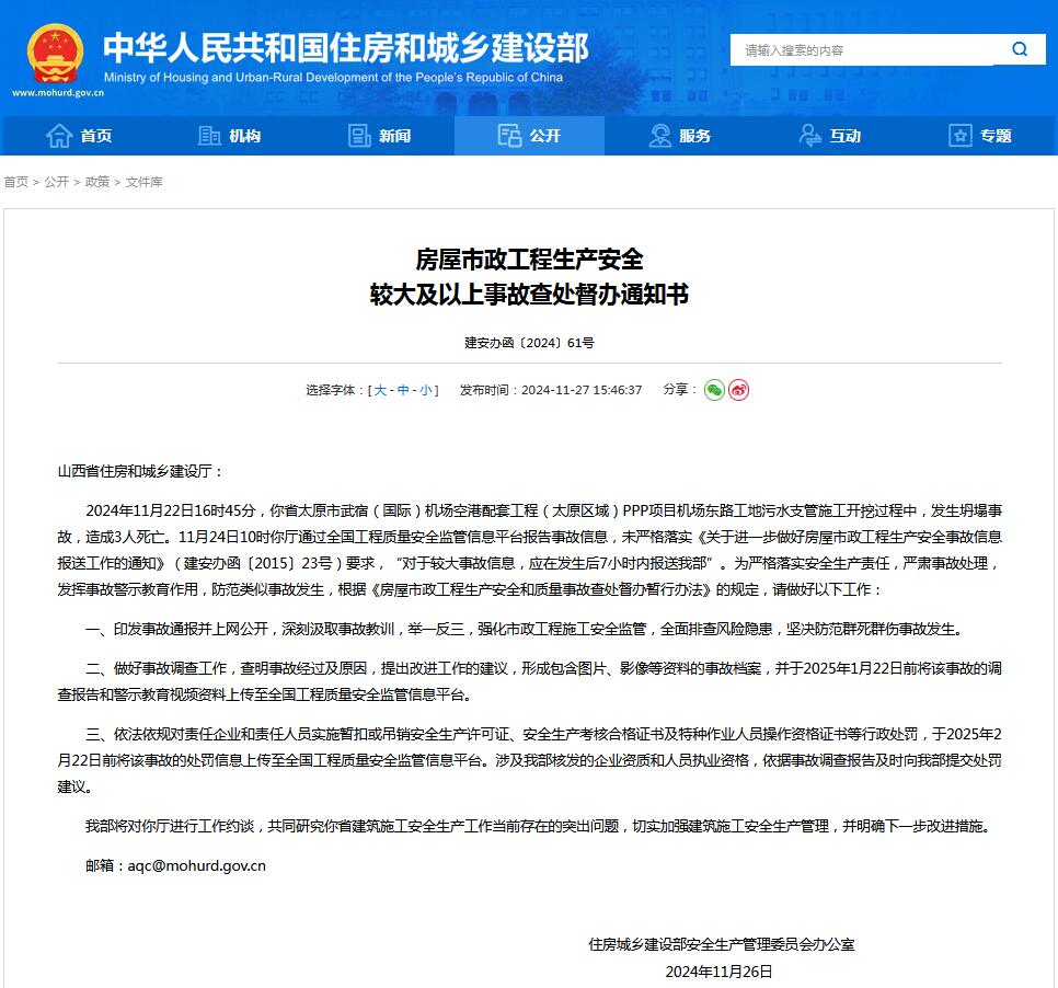 2024年11月22日16時45分,你省太原市武宿(國際)機場空港配套工程(太原區域)PPP項目機場東路工地污水支管施工開挖過程中,發生坍塌事故,造成3人死亡。11月24日10時你廳通過全國工程質量安全監管信息平台報告事故信息,未嚴格落實《關於進一步做好房屋市政工程生產安全事故信息報送工作的通知》(建安辦函〔2015〕23號)要求,“對於較大事故信息,應在發生後7小時內報送我部”。為嚴格落實安全生產責任,嚴肅事故處理,發揮事故警示教育作用,防範類似事故發生,根據《房屋市政工程生產安全和質量事故查處督辦暫行辦法》的規定,請做好以下工作: