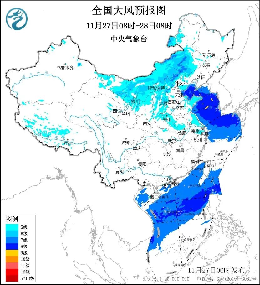 預計,11月27日08時至28日08時,內蒙古大部、寧夏、陝西北部、山西、河北、北京、天津、河南大部、遼寧西部、山東、上海、江蘇、浙江北部等地部分地區有4~5級、陣風6~8級的大風;渤海、渤海海峽、黃海大部海域、東海北部海域將有7~8級、陣風9~10級的西北風,台灣海峽、台灣東南洋麪、巴士海峽、南海北部和中部海域、北部灣將有7~8級、陣風9級的偏東到東北風。