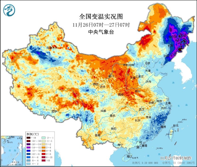 今晨,降温主要在東北地區和江南東部一帶,山東半島、上海、浙江東部和南部、福建、廣東東部等地出現4~8℃降温,黑龍江中部、吉林中東部、遼寧東部等地降幅達10~20℃。氣温0℃線位於陝西南部至山西南部、山東中部一帶。