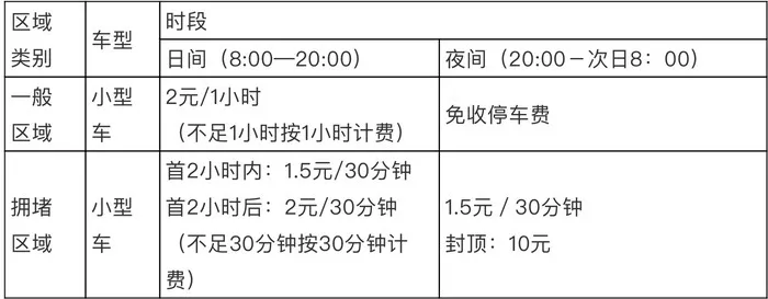 *以小型車為例,**擁堵區域劃定後,**一般區域的道路停車泊位收費標準,日間(8:00-20:00)執行現行收費標準,即1小時收費2元(不足1小時按1小時計費),夜間(20:00-次日8:00)免收停車費,*不增加羣眾停車負擔。擁堵區域道路停車泊位計費單位設置為30分鐘,實行階梯計費:首2小時內,每30分鐘按1.5元計費;首2小時後,每30分鐘按2元計費(不足30分鐘按30分鐘計費);夜間每30分鐘按1.5元收費,10元封頂。