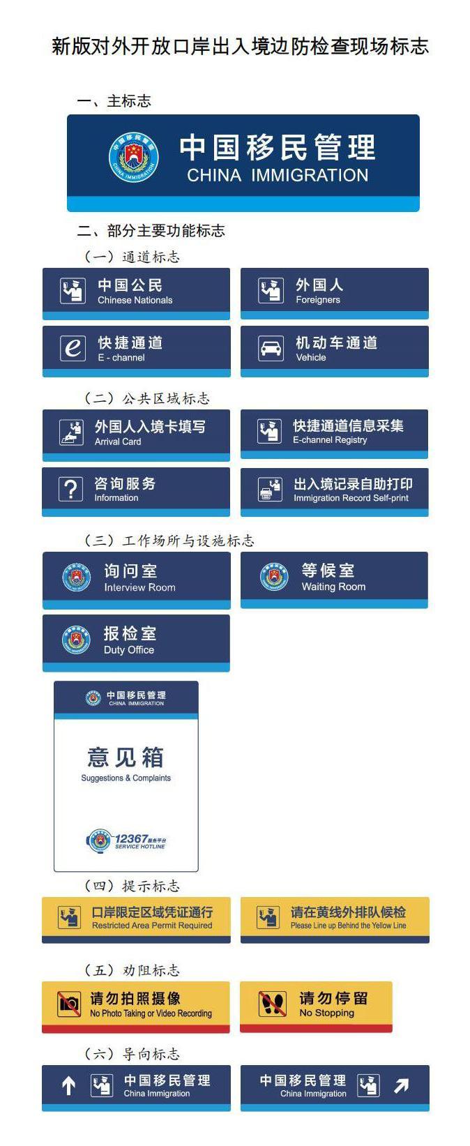 新版對外開放口岸出入境邊防檢查現場標誌分為主標誌和功能標誌兩類。主標誌是在對外開放口岸標示出入境邊防檢查機關的標誌,由中國移民管理標誌和“中國移民管理”中英文字共同組成。其中,中國移民管理標誌已於2021年4月2日啓用。功能標誌是在對外開放口岸出入境邊防檢查現場標示相關通道設施和提示導向的標誌,細分為6種70個,具體包括16個通道標誌,6個公共區域標誌,21個工作場所與設施標誌,9個提示標誌,9個勸阻標誌,9個導向標誌。