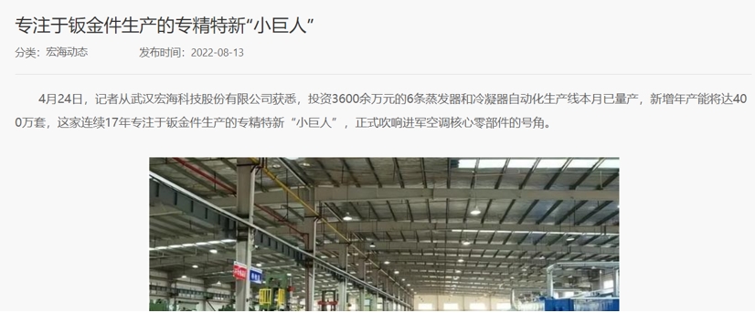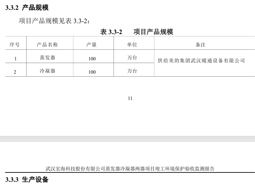 不僅如此,根據宏海科技官方網站在2022年8月發佈的《專注於鈑金件生產的專精特新“小巨人”》的資訊,其中提到:“投資3600餘萬元的6條蒸發器和冷凝器自動化生產線本月已量產,新增年產能將達400萬套”。但是根據《武漢宏海科技股份有限公司蒸發器冷凝器兩器項目 竣工環境保護驗收報告》第11頁公佈的“產品規模”信息,項目產品規模包括蒸發器100萬台和冷凝器100萬台,這與公司官網公佈的400萬套產能存在重大差異。