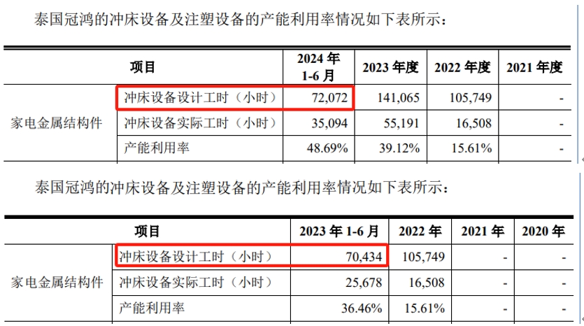 特別是衝壓設備還增加了1台的子公司泰國冠鴻,2023年上半年的衝牀設備及注塑設備的產能利用率數據顯示,家電金屬結構件衝牀設備設計工時為7.04萬小時,2024年上半年為7.21萬小時,淨增加了0.17萬小時。這也就意味着,宏海科技整體淨增加的0.12萬小時,全部來自於子公司泰國冠鴻;而衝壓設備淨增加了2台的宏海科技母公司,衝牀設備設計工時不僅沒有增加,相反還將出現一定幅度的減少。