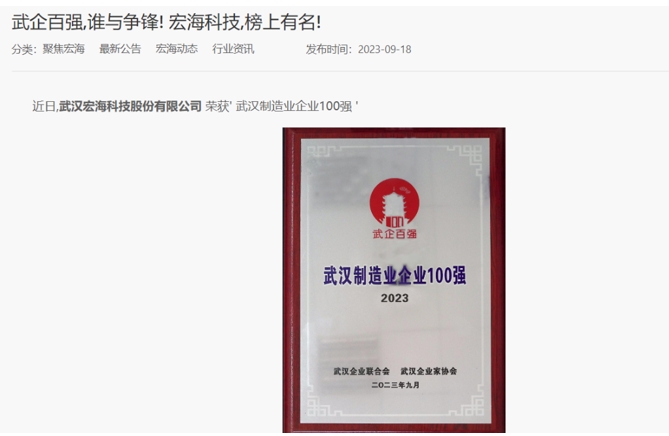 根據宏海科技官方網站在2023年9月發佈的《武企百強,誰與爭鋒! 宏海科技,榜上有名!》的資訊,其中提到武漢宏海科技股份有限公司榮獲“武漢製造業企業100強”,該資訊中還提到“依據申報企業經審計的2022年度營業收入,結合百強企業各項經營數據作出”,“本屆百強入圍門檻為48.04億元,比上屆提升4.91億元,同比增長11.38%”。
