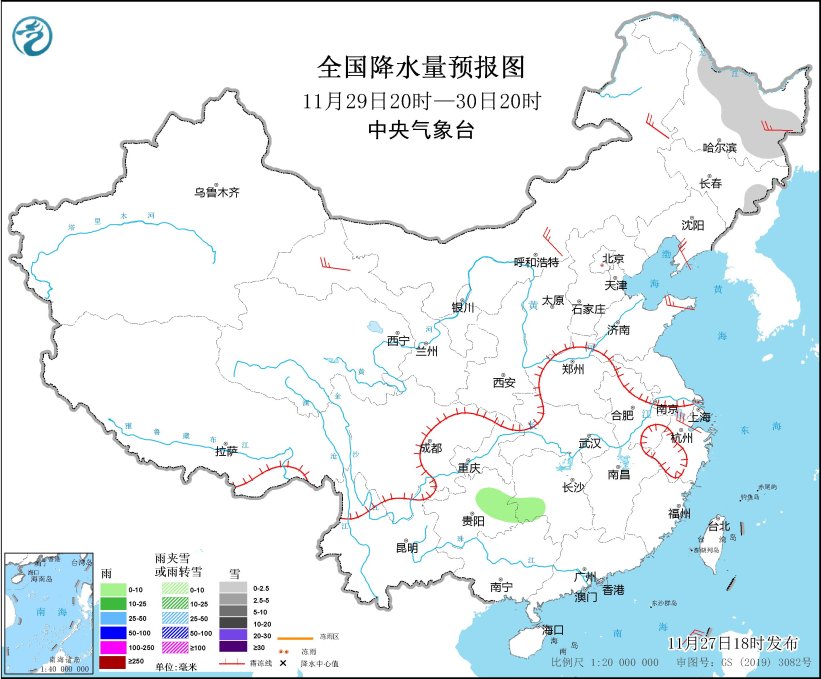 *11月28日20時至29日20時,*黑龍江大部、吉林中東部、青海東南部、西藏東部、川西高原等地部分地區有小雪或雨夾雪,黑龍江東部局地有中雪。雲南大部等地部分地區有小到中雨。內蒙古東部、黑龍江大部、遼東半島、山西北部、山東半島、蘇皖南部、浙江北部等地部分地區有4~6級風。渤海、黃海大部海域、東海大部海域、南海大部海域將有5~7級風、陣風8~9級(見圖3)。
