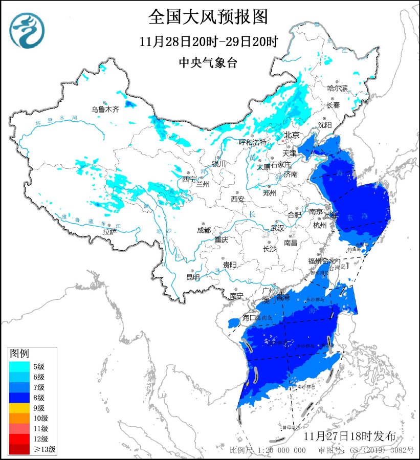 11月28日20時至29日20時,青海東部和南部、內蒙古中東部、河北北部、北京西部等地部分地區有4~5級、陣風6~8級的大風;渤海、渤海海峽、黃海大部海域、東海大部海域將有7~8級、陣風9~10級的西北風,台灣海峽、巴士海峽、南海大部海域、北部灣將有7~8級、陣風9級的東北風。