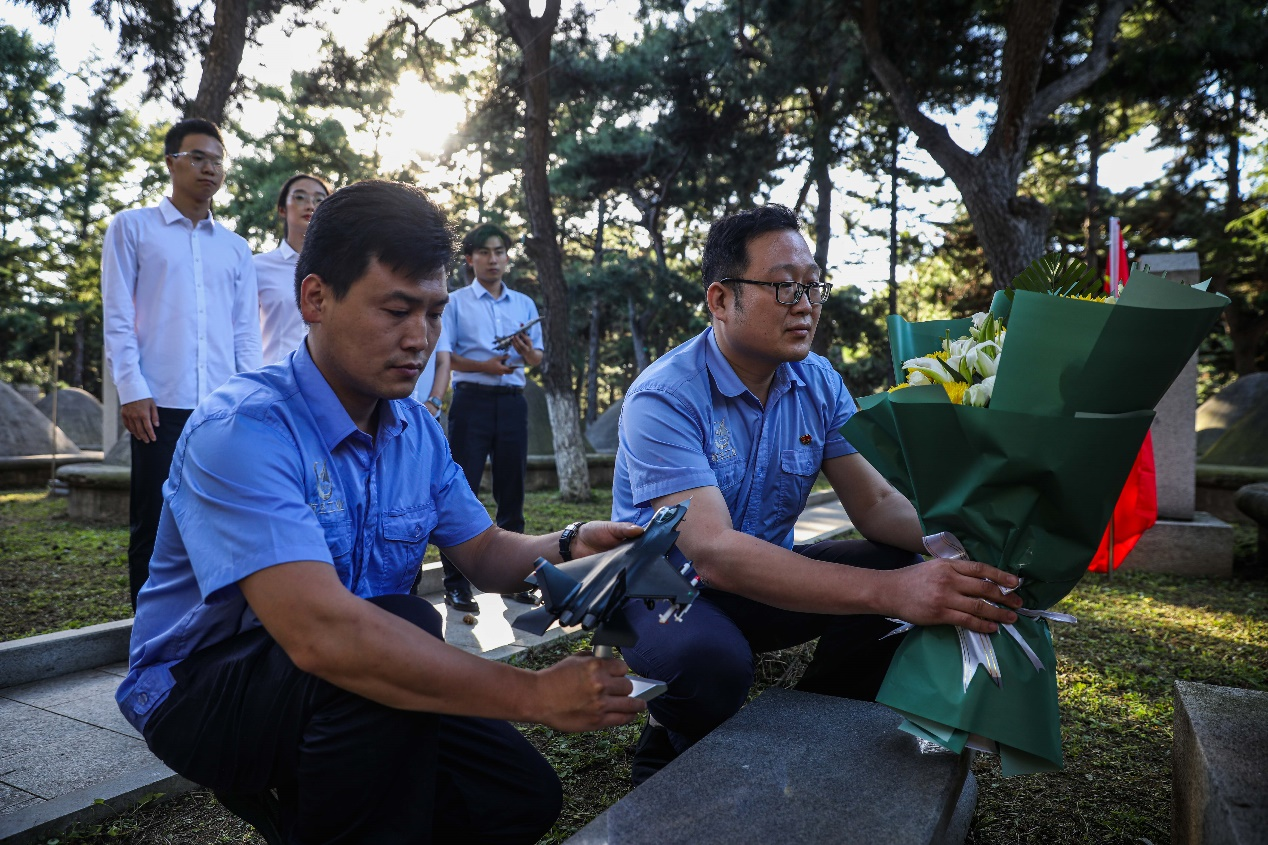 身穿“航空藍”的方文墨為志願軍空軍烈士孫生祿敬獻花束,並將他的墓碑擦拭乾淨。隨後,將一架沈飛生產的先進隱身戰機“鶻鷹”的模型放在墓前。“我們要接過英雄的接力棒,把祖國建設得越來越好!”方文墨説。