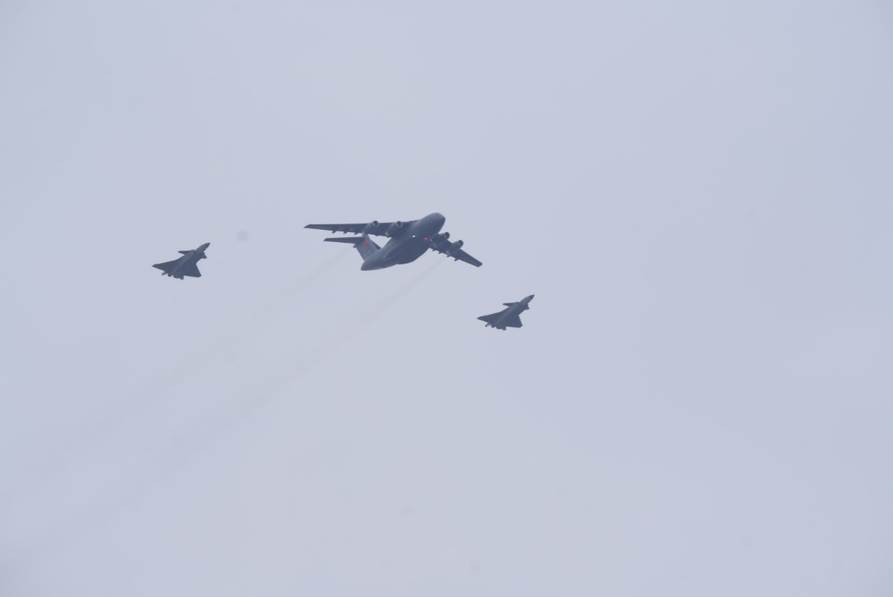 2023年,第十批在韓中國人民志願軍烈士遺骸回國,“運-20”和兩架護航飛機“殲-20”。人民網記者 邱宇哲攝