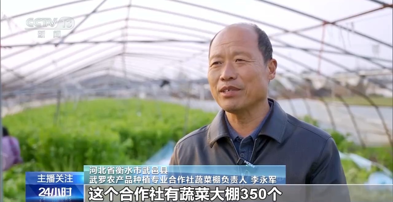 河北省衡水市武邑縣武羅農產品種植專業合作社蔬菜棚負責人 李永軍:合作社有蔬菜大棚350個,現在每天可以採摘芹菜、茄子、菜花等各種蔬菜10餘噸。當天直接運往京津冀地區,採摘週期在20天左右,每年各種蔬菜的畝產量都在30000斤以上。