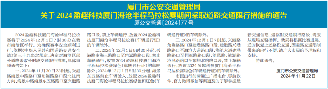 一、2024年11月30日23時起,興港路海景中路路口至角嵩路路口段北往南方向、海景中路海景東五路路口至興港路路口段,禁止車輛通行,放置2024盈趣科技廈門海滄半程馬拉松賽《車輛通行證》的車輛除外。