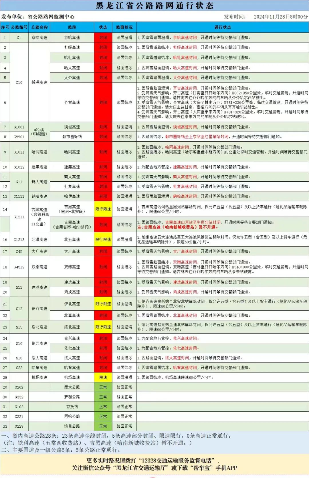 11月28日8時彙總路況信息:全線封閉的高速有(23條高速):牡綏高速、鶴大高速、建虎高速、北富高速、齊甘高速、大齊高速、依七高速、雞虎高速、密興高速、建黑高速、牡復高速、鶴哈高速、吉黑高速(吉黑省界-哈爾濱段)、都市圈環線、雙嫩高速、大廣高速、綏大高速、哈牡高速、哈同高速、哈大高速、哈肇高速、京哈高速、哈爾濱繞城高速,封閉。限行限速的高速有(5條高速):北漠高速、綏北高速(趙光站至通北站)、伊北高速、吉黑高速(黑河-北安段),僅允許五型(含五型)及以上貨車通行(危化品運輸車輛除外),限速60公里/小時。機場高速,限速80公里/小時。