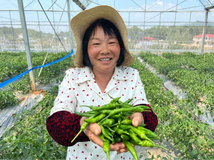 樟樹港辣椒種植大棚裏工人手捧新鮮採集的辣椒