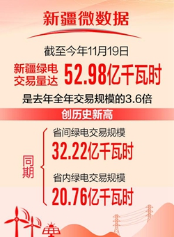天山網-新疆日報訊(記者陳薔薇報道)記者從國網新疆電力有限公司獲悉:截至11月19日,今年新疆綠電交易量達52.98億千瓦時,是去年全年交易規模的3.6倍,創歷史新高。