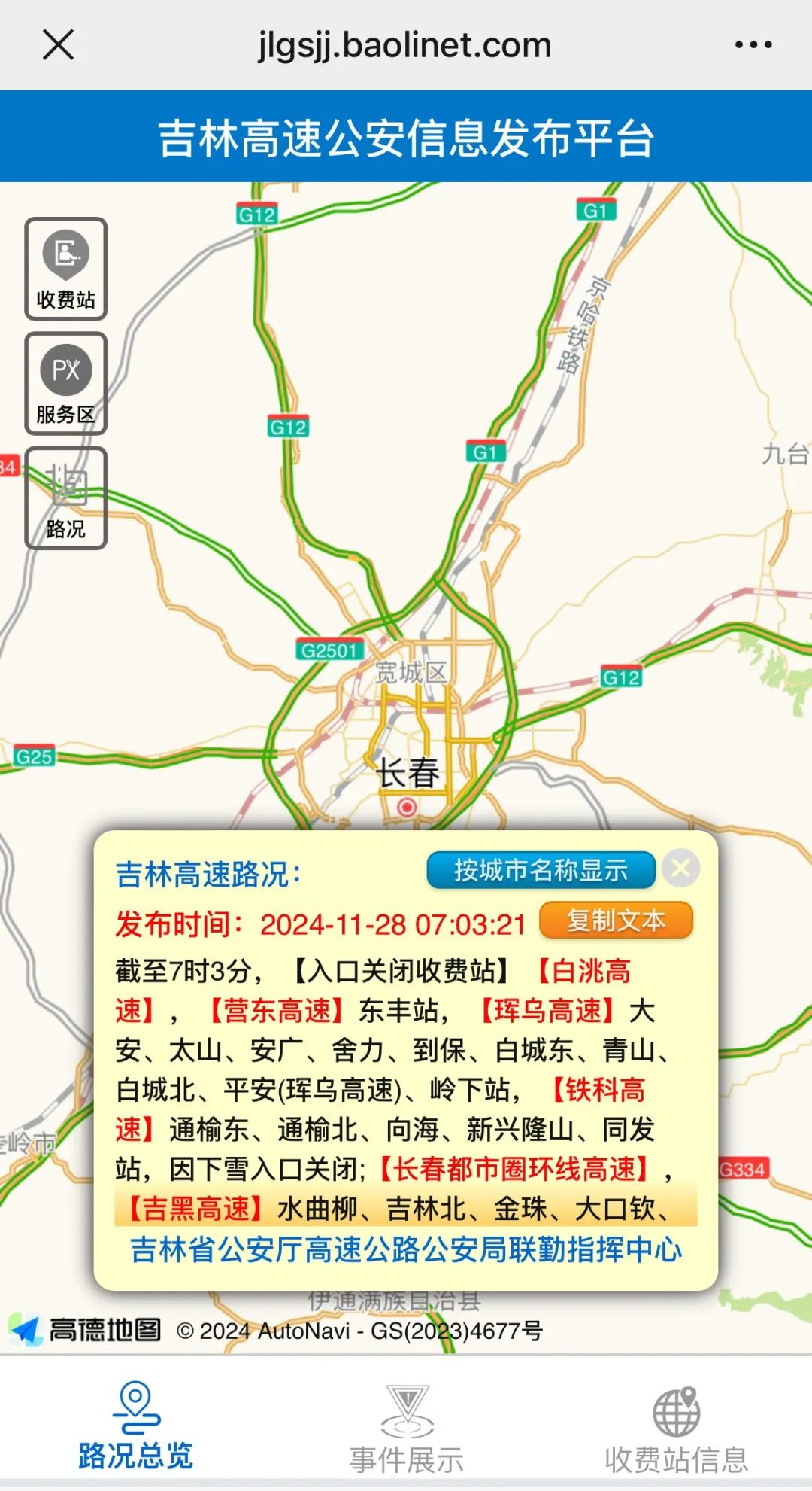 【集雙高速】三源浦、五女峯、柳河東、集安、清河、頭道、通化南站【長長高速】磐石南、朝陽鎮、輝南、撫民、靖宇、撫松、撫松新城、松江河、東崗、長白山站