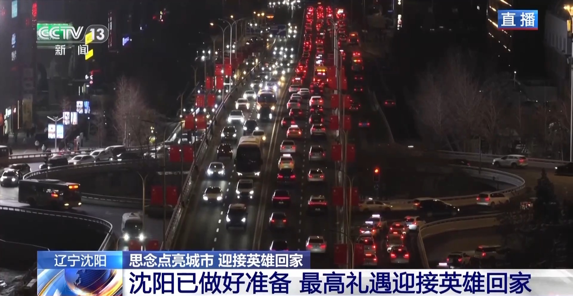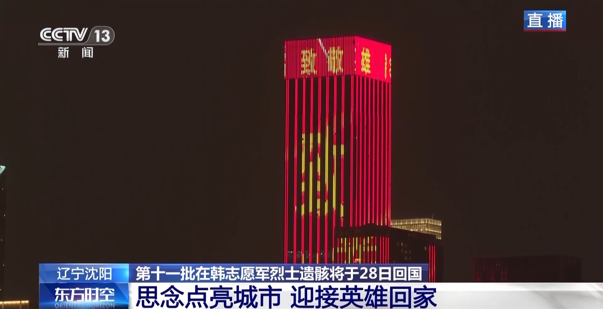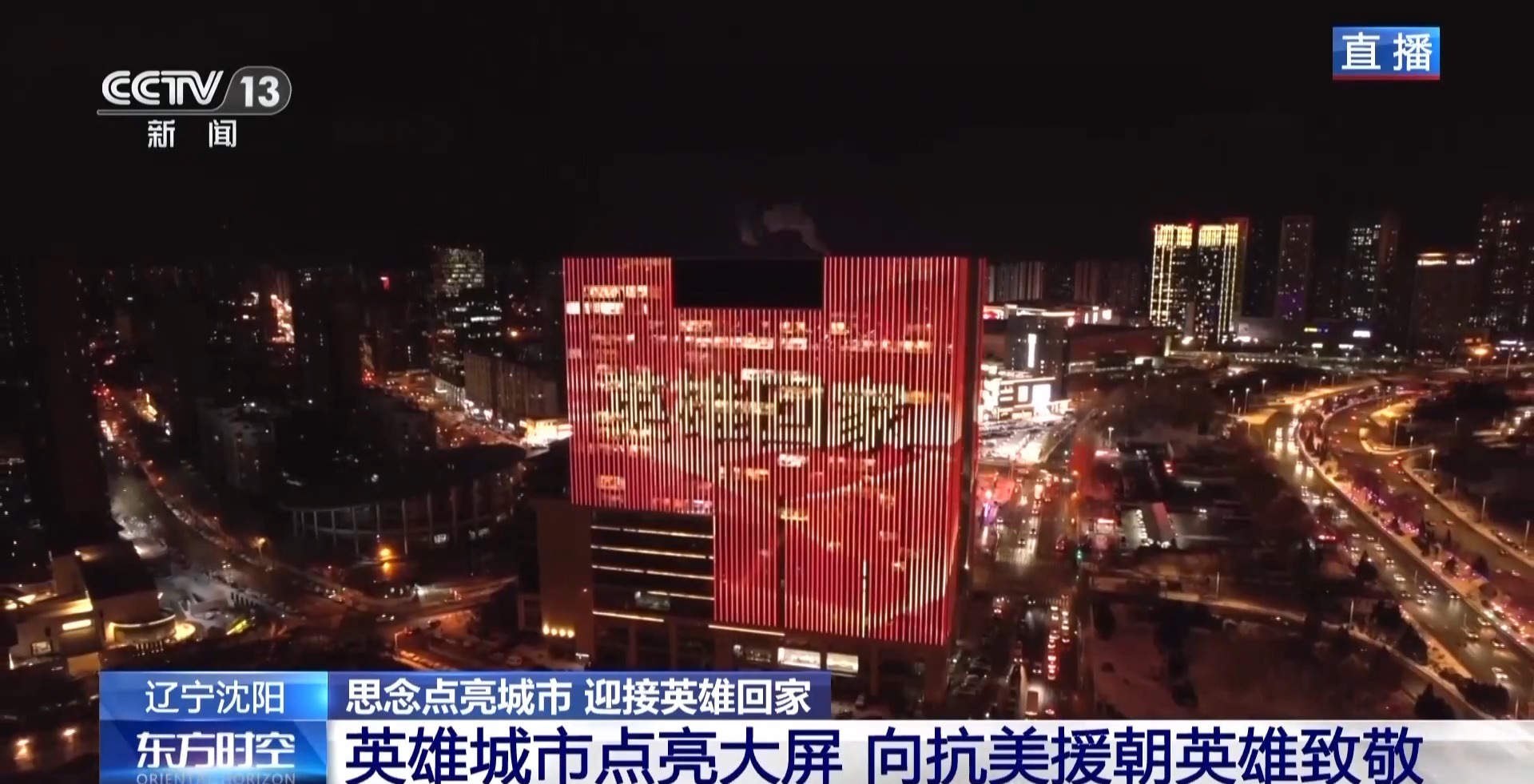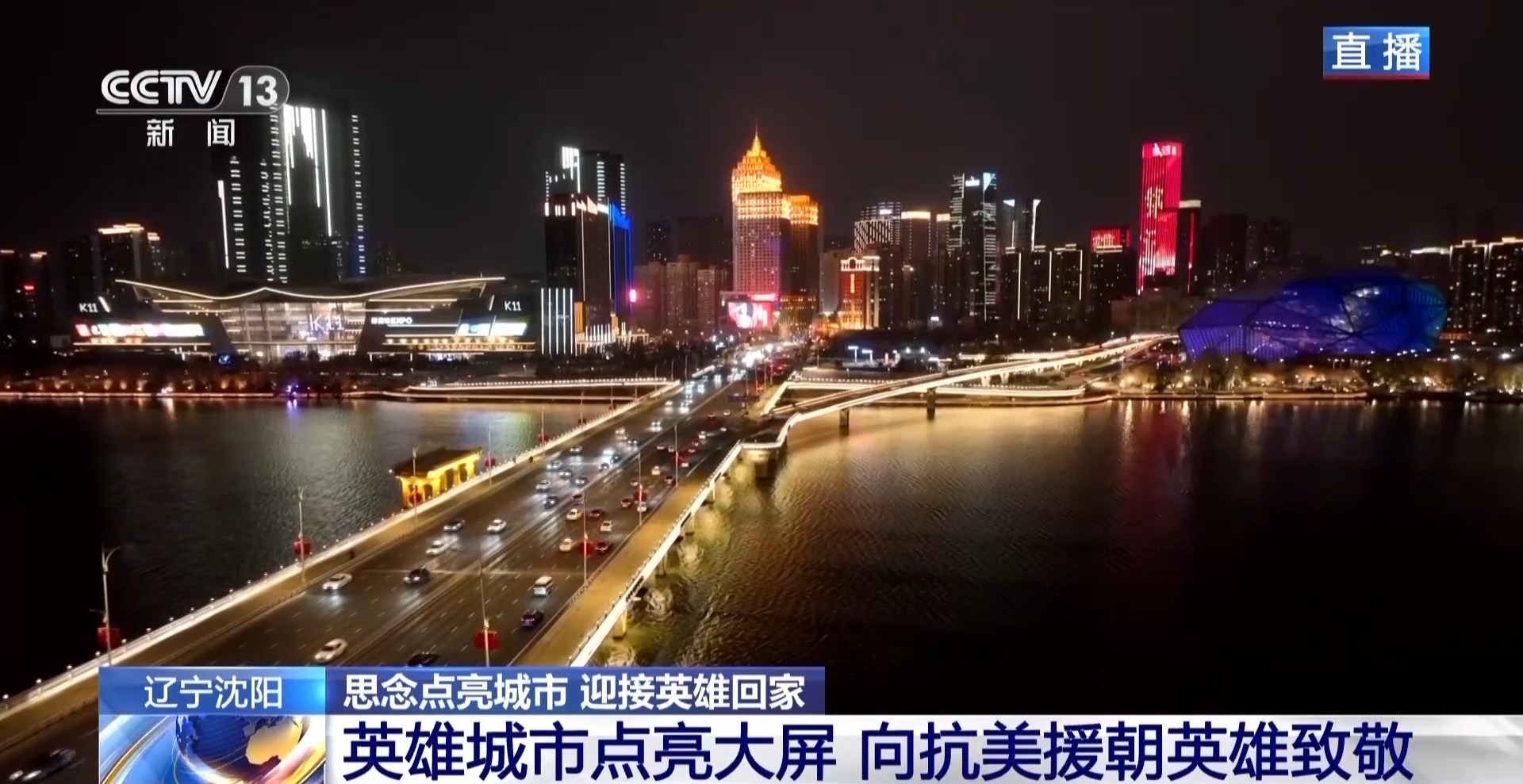 *總枱記者 賈鐵生:*瀋陽這座英雄城市,這兩天提前點亮了全城主要街道的大屏幕,向英雄致敬,迎接第十一批在韓中國人民志願軍烈士遺骸回家。