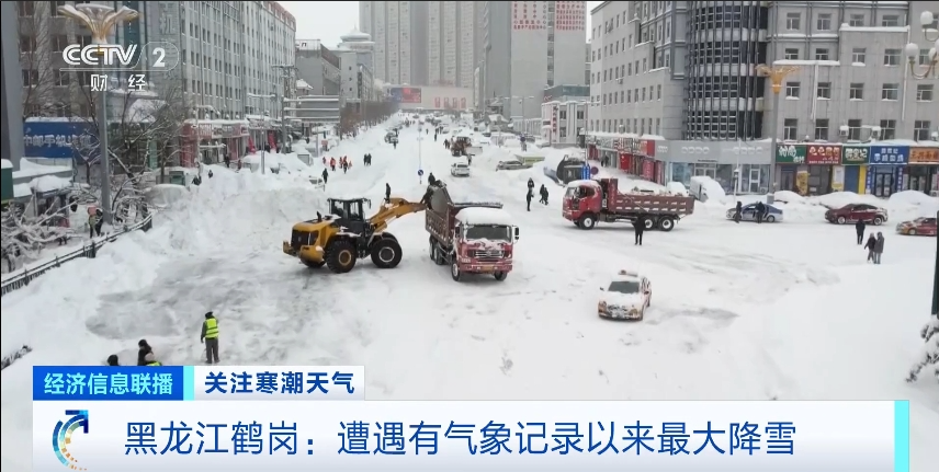 從25日晚上8點到27日中午12點,黑龍江省鶴崗市普降大暴雪,最大累計積雪深度49釐米。當地17個降雪觀測站中,有13個站點為特大暴雪量級,降雪導致城區道路積雪結冰,當地環衞部門已經連續清雪30多個小時。