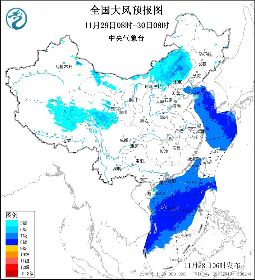 11月29日08時至30日08時,內蒙古中東部、河北北部、北京西部、山東半島等地部分地區有4~5級、陣風6~8級的大風;渤海、渤海海峽、黃海大部海域、東海大部海域將有7~8級、陣風9~10級的西北風,台灣海峽、巴士海峽、南海大部海域將有7~8級、陣風9級的東北風。