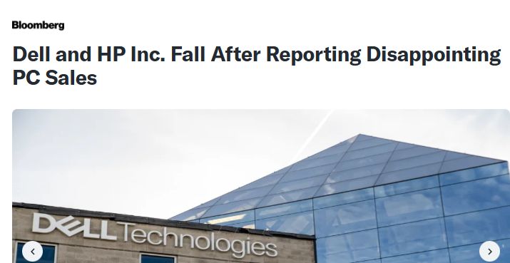 【環球網財經綜合報道】11月28日,據彭博社消息,戴爾科技公司與惠普公司相繼公佈了令人失望的第三季度業績報告,兩家公司的個人電腦業務均未達市場預期,導致股價在週三出現大幅下跌,為期待個人電腦市場復甦的投資者帶來了不小的打擊。
