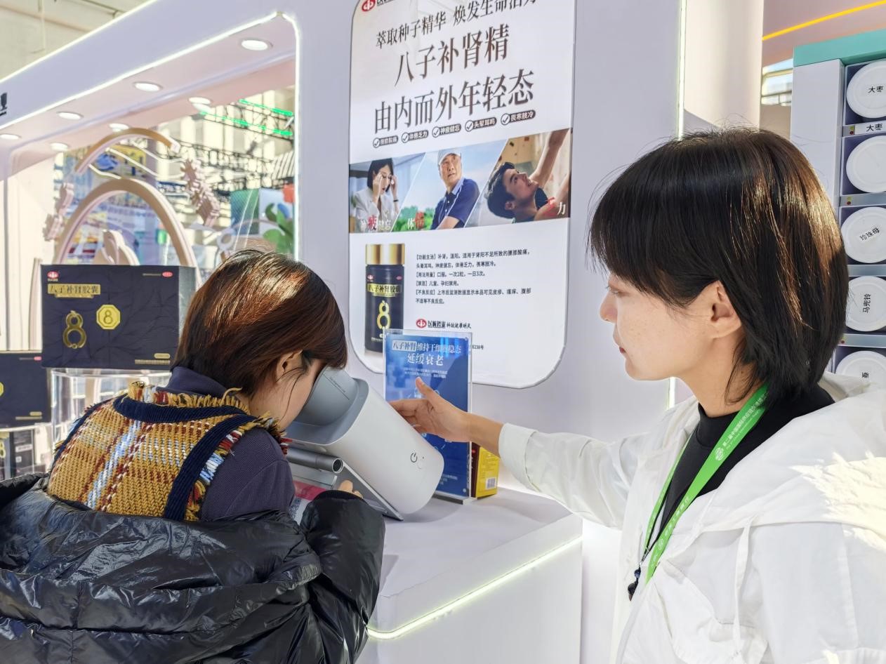 近年來,抗衰老成為很多人的關注焦點。藉助“鷹瞳”設備,分析視網膜影像,利用算法分析可以為檢測者早期檢查、輔助診斷以及評估慢性病的風險——位於以嶺藥業展台的八子補腎抗衰體驗區演示了這樣一幕。“通過視網膜可識別的慢性疾病包括糖尿病、高血壓、心腦血管疾病在內的200多種常見疾病,您需要摘掉眼鏡,將眼睛對準檢測處,稍後檢測報告會發到您的手機上。”工作人員為興致勃勃的觀眾詳細講解操作步驟。