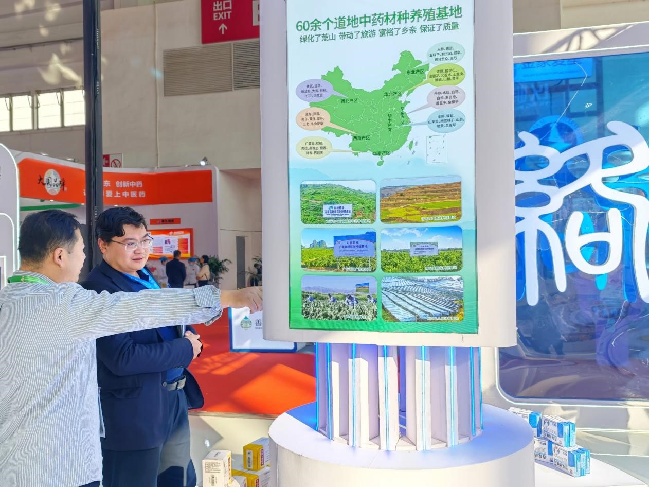 以嶺藥業的展台上,一幅標註了“60餘個道地中藥材種養殖基地”的中國地圖,吸引了不少觀眾駐足。