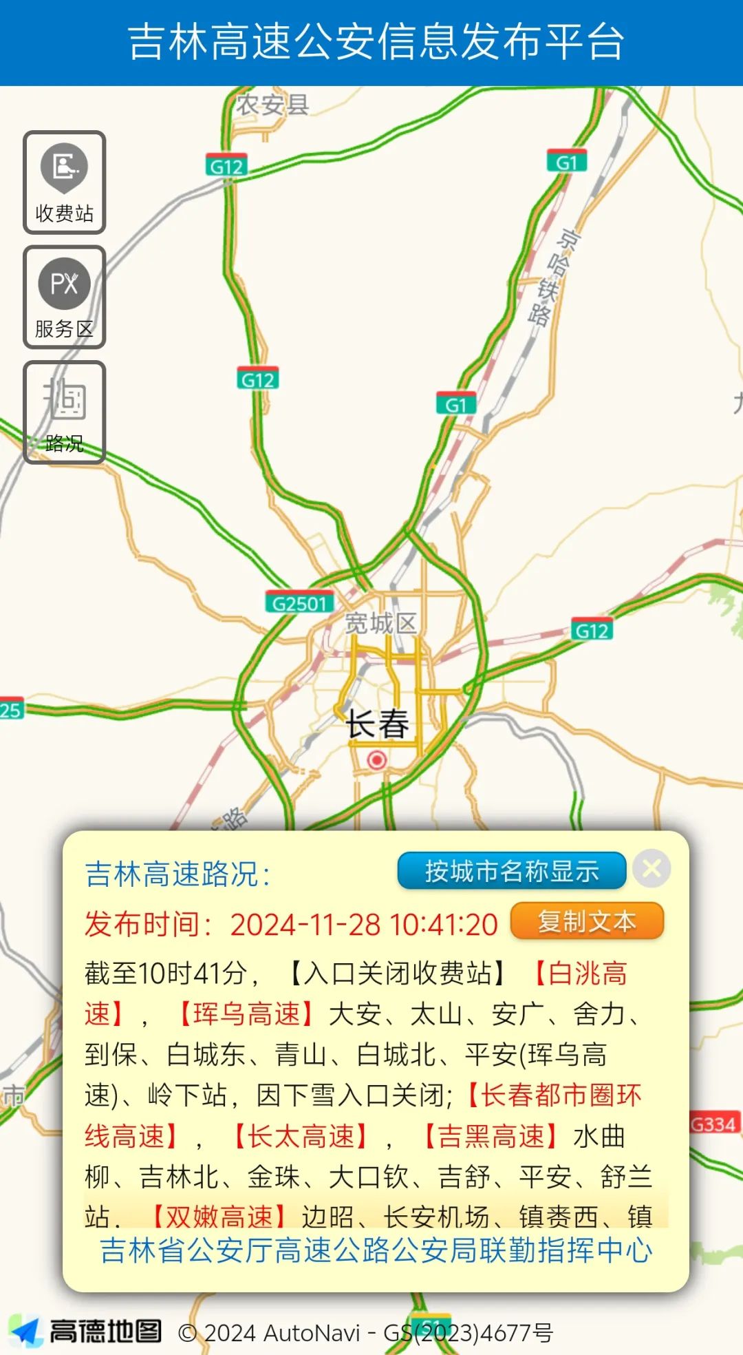 根據吉林高速交警即時路況,截至2024年11月28日10時41分,受降雪影響,吉林省高速公路入口關閉、限行收費站詳情如下——