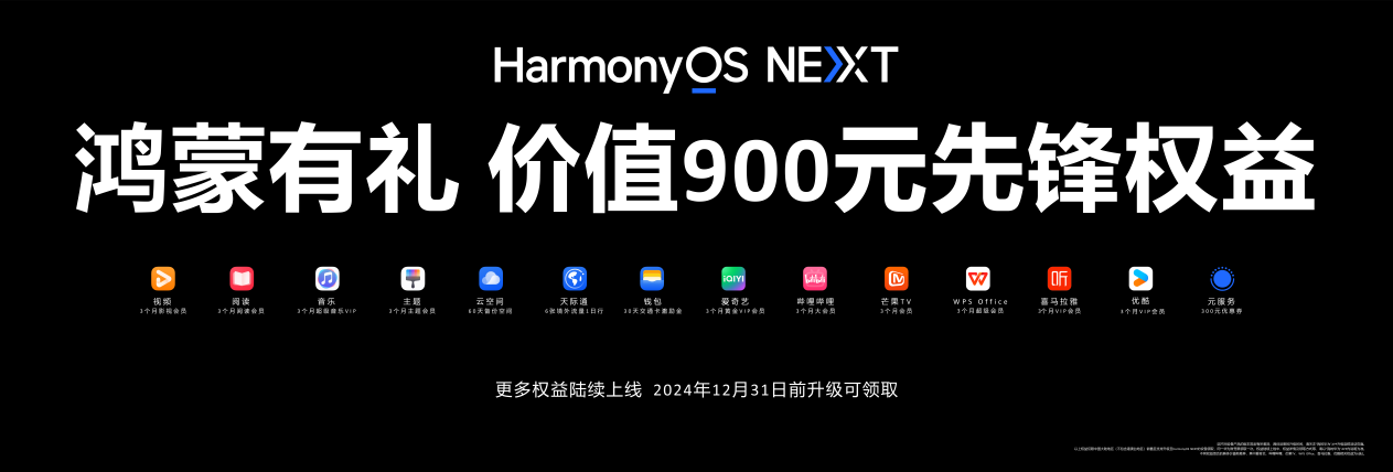 具體來説,包含了華為視頻、閲讀、音樂、主題、雲空間、天際通、錢包以及愛奇藝、嗶哩嗶哩、芒果 TV、WPS Office、喜馬拉雅、優酷等眾多應用的會員和活動權益,後續還會有元服務優惠券等陸續上線。這些權益覆蓋了生活、辦公、娛樂、出行等多個鴻蒙生態核心應用場景,未來還將進一步拓展,以滿足用户更多樣化的需求。領取方式也較為便捷,在 2024年12月31日前參與原生鴻蒙升級的用户,可通過 “我的華為”APP 按指引獲取。