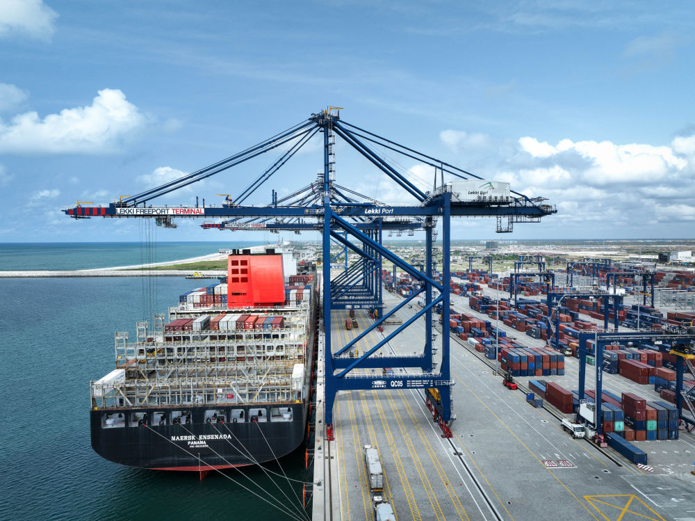 3月11日,一艘貨輪在尼日利亞拉各斯萊基深水港裝卸集裝箱(無人機照片)。新華社發(萊基港公司供圖)