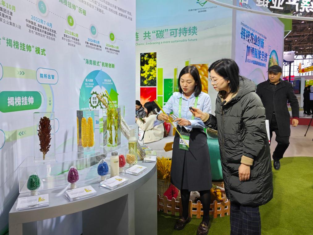 第二屆中國國際供應鏈促進博覽會先正達展台上,工作人員介紹“揭榜掛帥”項目科研成果。新華社記者張曉潔 攝
