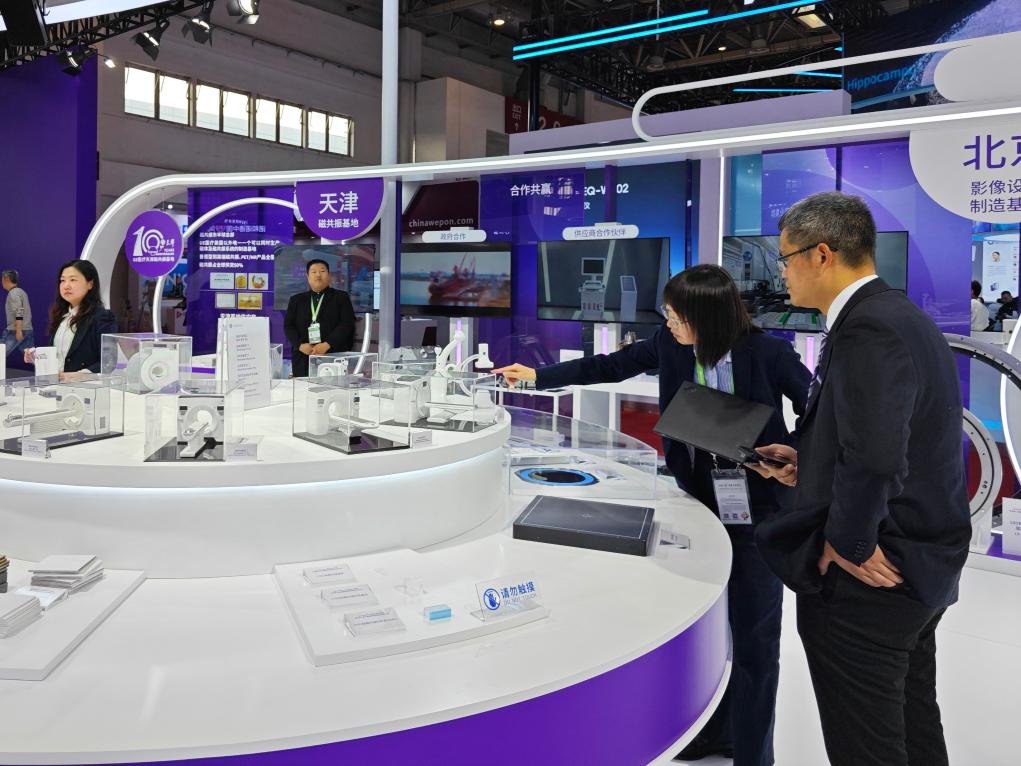 第二屆中國國際供應鏈促進博覽會GE醫療展台上,工作人員(右二)在介紹展品。新華社記者張曉潔 攝