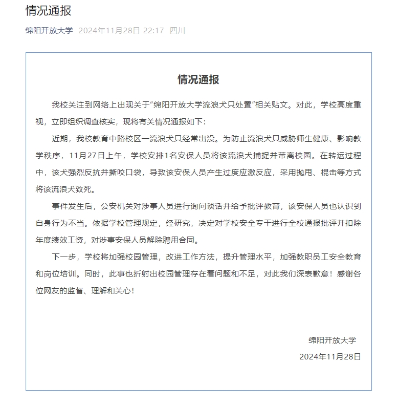 四川綿陽開放大學通報“保安持棍將流浪狗打死”:對涉事安保人員解除聘用