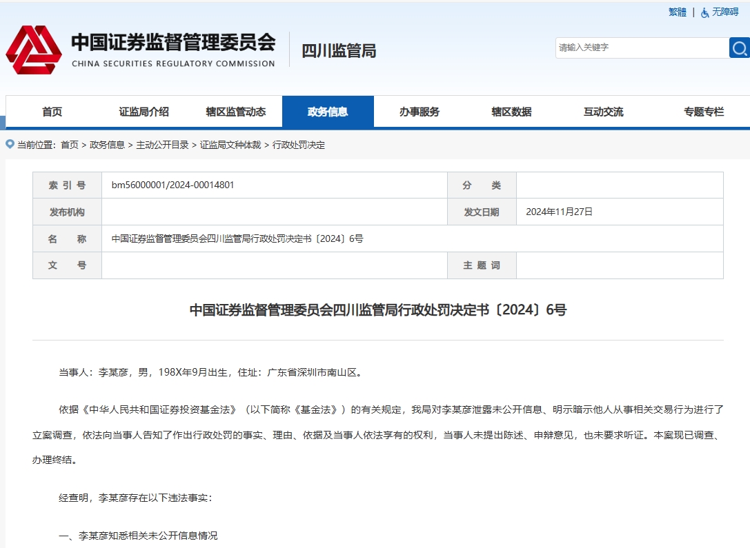 值得一提的是,11月27日,證監會四川監管局發佈一則行政處罰決定書。處罰決定書提到,李某彥因涉及泄露未公開交易信息;明示、暗示他人從事相關交易的行為,被責令改正,合計處以140萬元的罰款。其中,針對明示、暗示他人從事相關交易的行為,李某彥被沒收違法所得142,889.49元。而根據罰單披露信息,直接指向正是李淑彥。