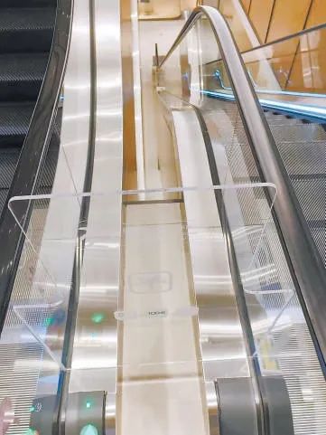但是,這個玻璃護欄本身的強度存在疑問。凸字形玻璃護欄,僅有底部左右兩條邊使用玻璃膠與扶梯固定在一起,能不能承受乘客的倚靠,並不確定。