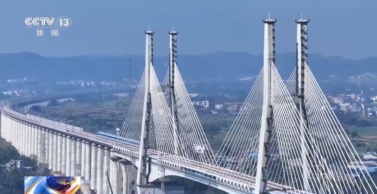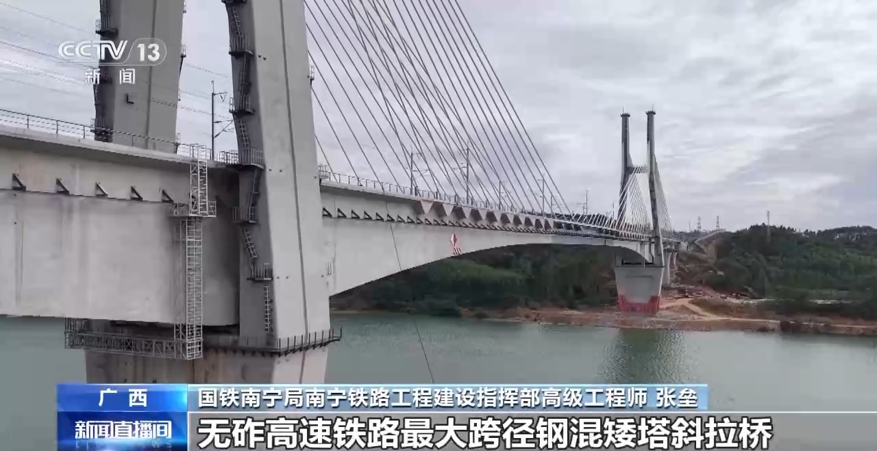 *國鐵南寧局南寧鐵路工程建設指揮部高級工程師 張壘:*為滿足大橋行車要求,我們採用混凝土梁、鋼混結合段及鋼箱梁三部分組成的設計施工方案,這是目前國內在建時速350公里無砟高速鐵路最大跨徑鋼混矮塔斜拉橋。