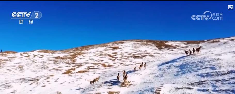 新疆的冬日美景不止於此。在昌吉市的江布拉提草原,白雪輕覆,山野蒼茫。記者用無人機拍攝到野生天山馬鹿,時而聚集奔跑在山谷,時而悠然漫步于山間。它們之中還有一隻領頭的成年雄鹿站在山脊,威風凜凜。據瞭解,野生天山馬鹿是國家二級保護動物,棲息於海拔1500—3800米的高山草原地帶。在北天山深山叢林中,自然繁殖的種羣已不足1萬隻。新疆昌吉市江布拉提草原已連續十年發現野生天山馬鹿的身影。