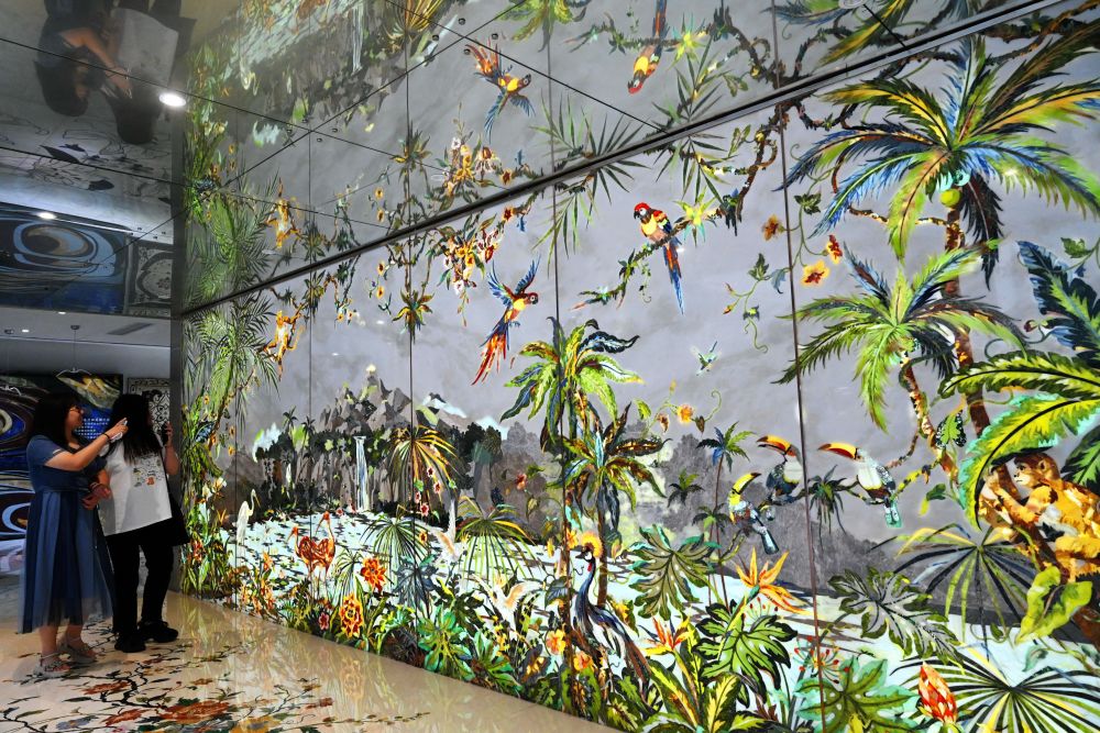 5月30日,英良五號倉庫·石材自然歷史博物館展示的由天然石材製成的水刀拼花工藝裝飾。新華社記者 林善傳 攝