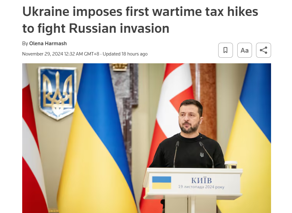 據路透社11月29日報道,烏克蘭總統澤連斯基28日簽署了烏克蘭首次戰時增税法案。目前俄烏衝突已進入第34個月。烏克蘭財政部長馬爾琴科稱,該法案對於確保明年烏克蘭國防部門順利獲得資金至關重要。他説,這些變化將從今年12月1日起生效。