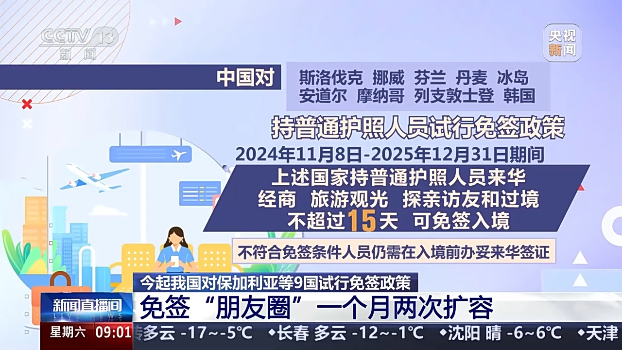 *11月1日外交部發布消息,對斯洛伐克、挪威、芬蘭、丹麥、冰島、安道爾、摩納哥、列支敦士登、韓國持普通護照人員試行免籤政策。*2024年11月8日至2025年12月31日期間,上述國家持普通護照人員來華經商、旅遊觀光、探親訪友和過境不超過15天,可免簽入境。不符合免籤條件人員仍需在入境前辦妥來華簽證。