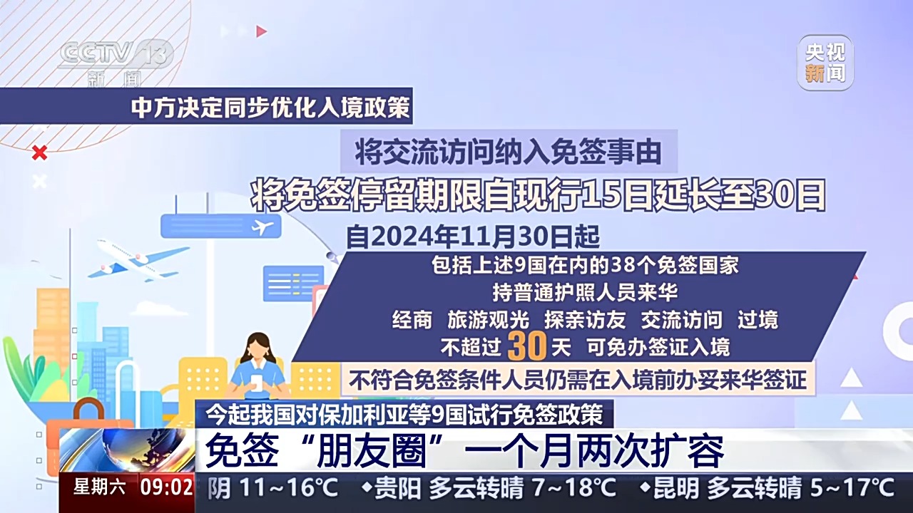 此外,中方決定同步優化入境政策,將交流訪問納入免籤事由,將免籤停留期限自現行15日延長至30日。自2024年11月30日起,包括上述9國在內的38個免籤國家持普通護照人員來華經商、旅遊觀光、探親訪友、交流訪問、過境不超過30天,可免辦簽證入境。不符合免籤條件人員仍需在入境前辦妥來華簽證。