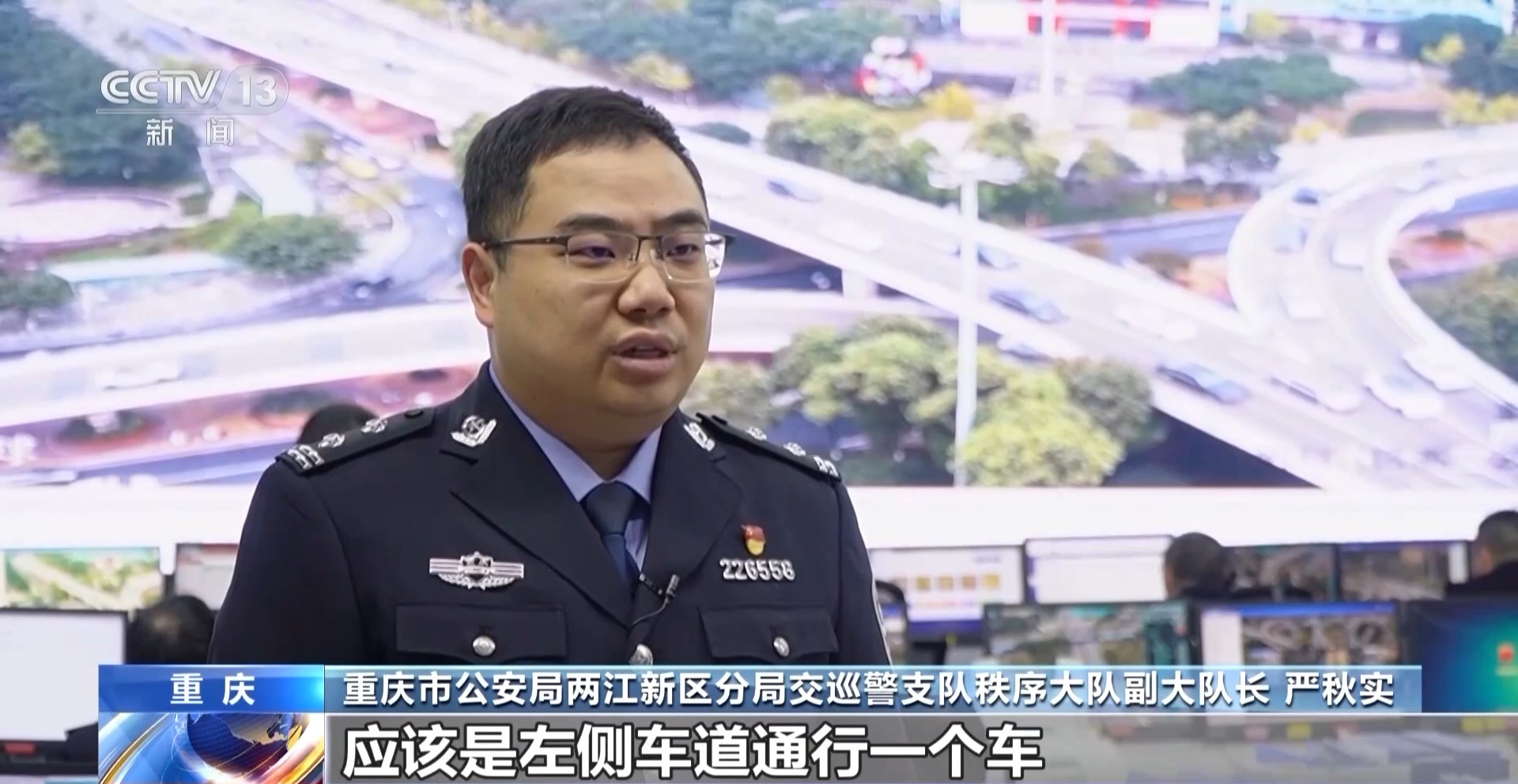 *重慶市公安局兩江新區分局交巡警支隊秩序大隊副大隊長 嚴秋實:*交替通行簡單地説就是一讓一,左右兩個車道合併成一個車道時,應該是左側車道通行一個車,右側車道通行一個車,這樣交替進行。就像拉拉鍊一樣,我們又叫它拉鍊式通行。