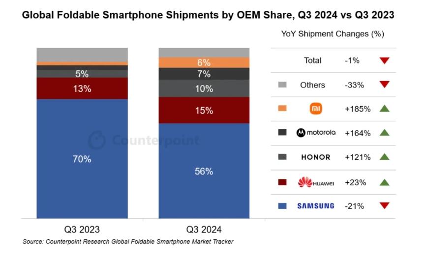 機構:2024年Q3全球摺疊屏手機出貨量同比下降1%
