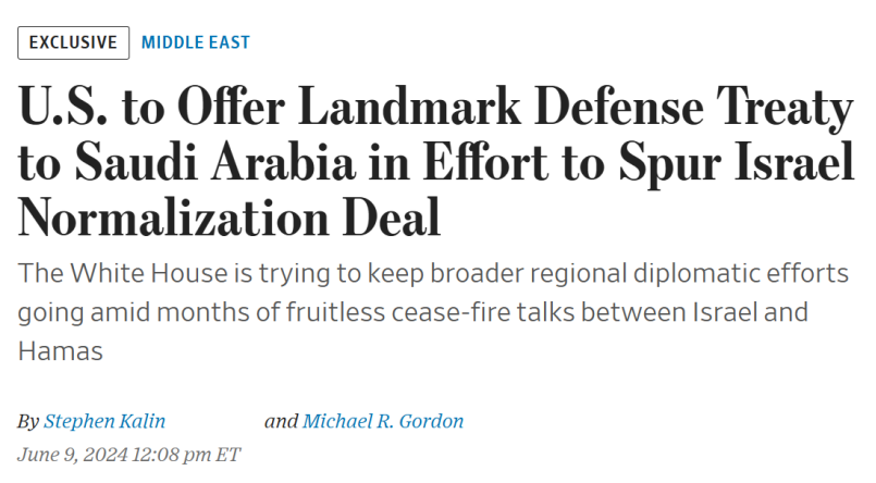在今年6月的一則報道中,美國《華爾街日報》表示,美國拜登政府向沙特提出了一份“歷史性的”防務協議,美國承諾協防沙特,以換取沙特和以色列的關係正常化。包括《華爾街日報》等媒體曾宣稱,這項防務協議的內容“幾近完成”。