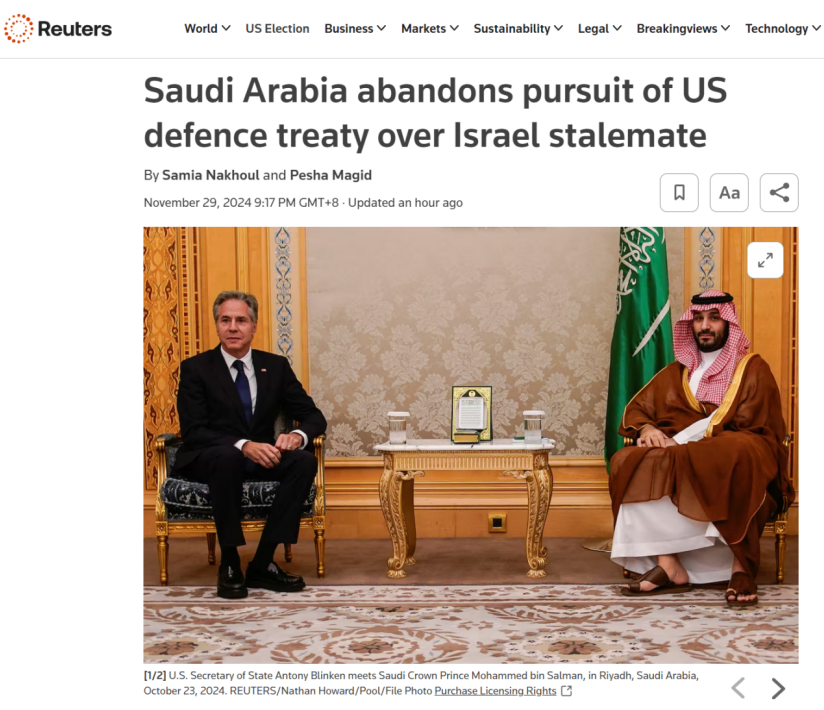 但路透社在11月29日的報道中援引2名沙特官員和4名西方官員的消息稱,沙特最終放棄了與美國簽署這一“激進”的協議,目前雙方正推動達成一項更適度的軍事合作協議。