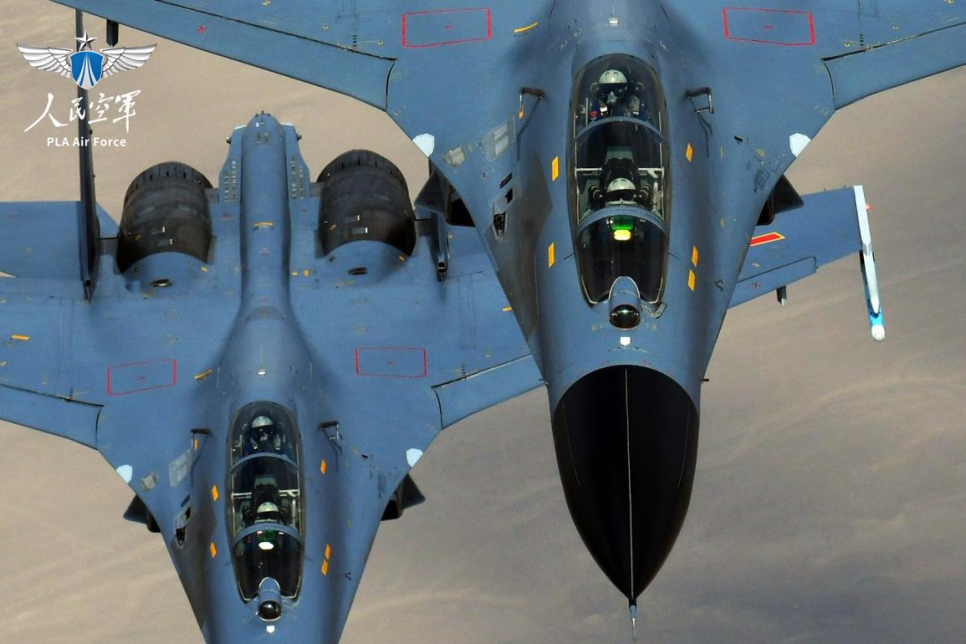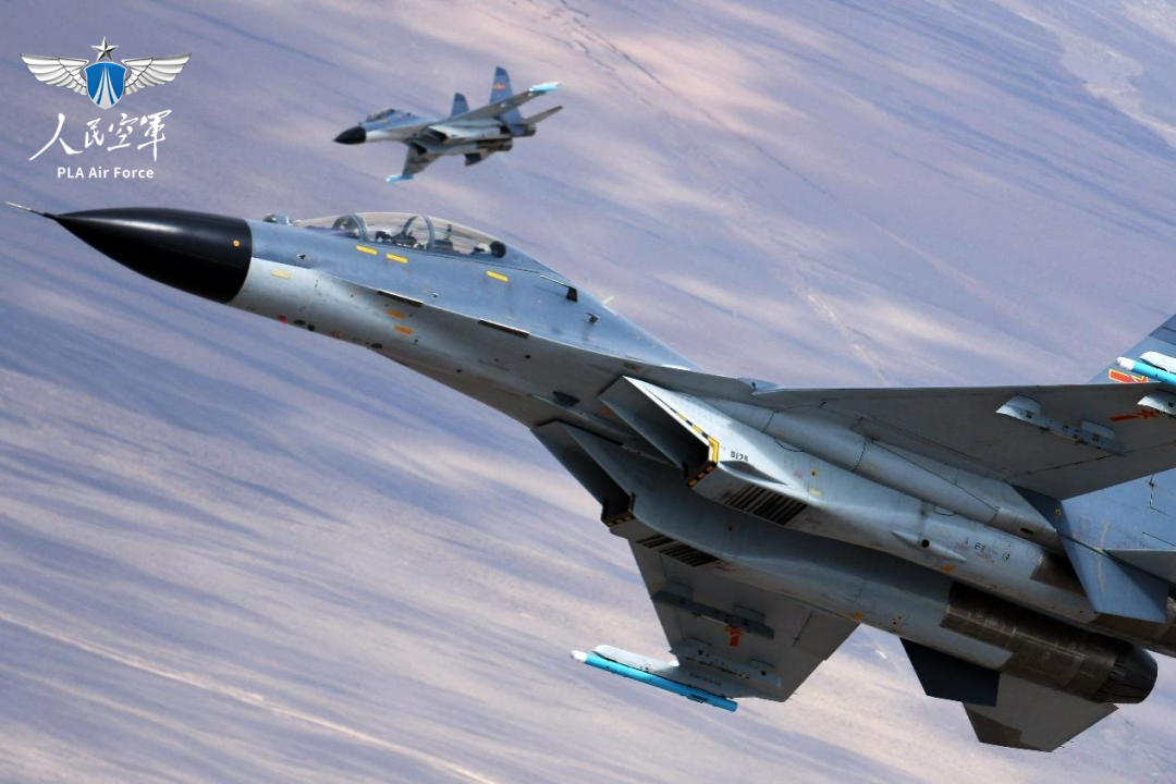 2022年8月7日,空軍航空兵某部開展的對抗空戰訓練中,殲-11B戰鬥機長僚機協同出擊。