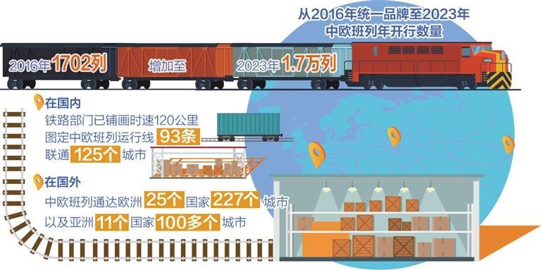 2016年統一品牌以來,中歐班列年開行數量由1702列增至2023年1.7萬列,年運輸貨值增長超7倍。開行萬列所需時間由開行之初的90個月縮短至6個月。這份運行成績單,彰顯中歐班列服務共建“一帶一路”亮眼成效。