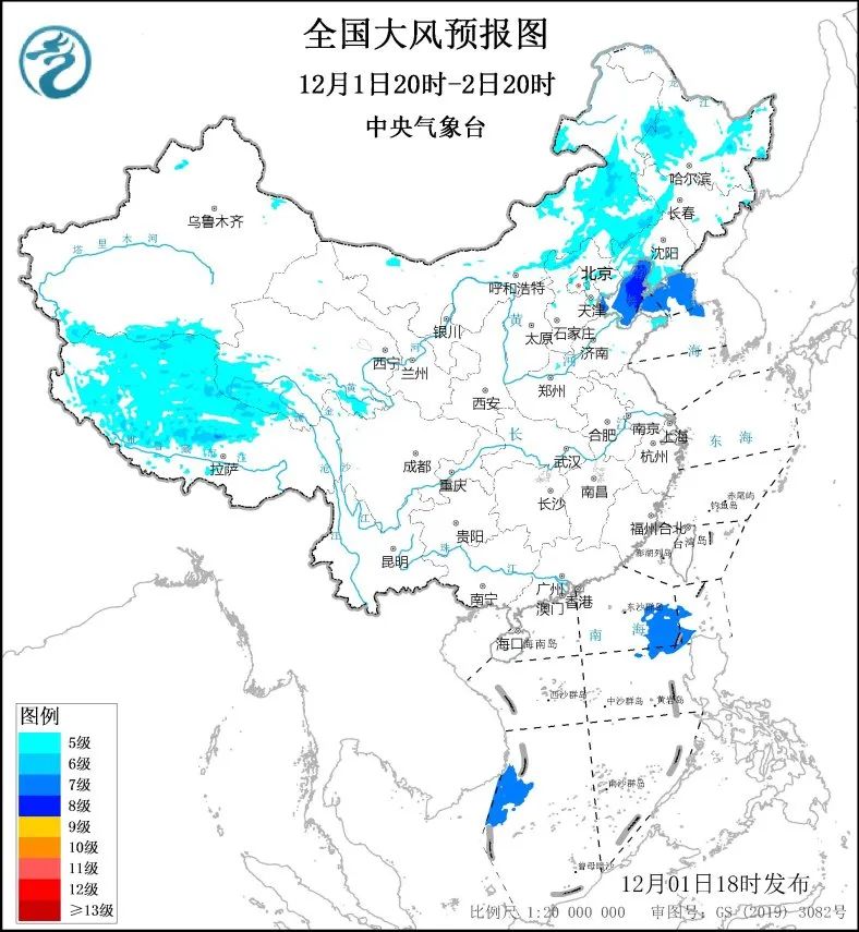 預計,12月1日20時至2日20時,西藏北部和西部、內蒙古東部、黑龍江西部、吉林西部、遼寧西部和南部、山東半島東部等地將有5~6級、陣風7~8級風;渤海、渤海海峽、黃海北部、南海東北部海域將有7~8級、陣風9級的偏北風。