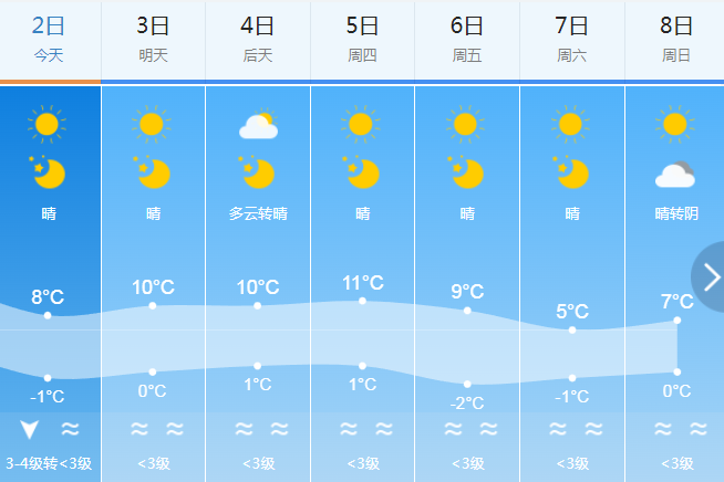 夜間最低氣温:沿海地區1℃左右,其他地區-2℃左右。