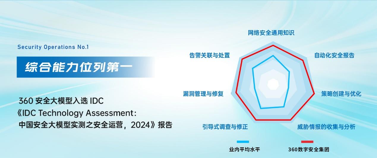 近日,全球領先的IT市場研究和諮詢公司IDC發佈《IDC Technology Assessment:中國安全大模型實測之安全運營,2024》(Doc#CHC52725024,2024年11月)報告,對中國安全大模型產品在安全運營領域的應用落地情況從七大維度開展實測,360安全大模型憑藉領先的技術能力和業務水平,在告警關聯與處置、策略創建與優化、引導式調查與修正、威脅情報的收集與分析等多個維度位居首位。