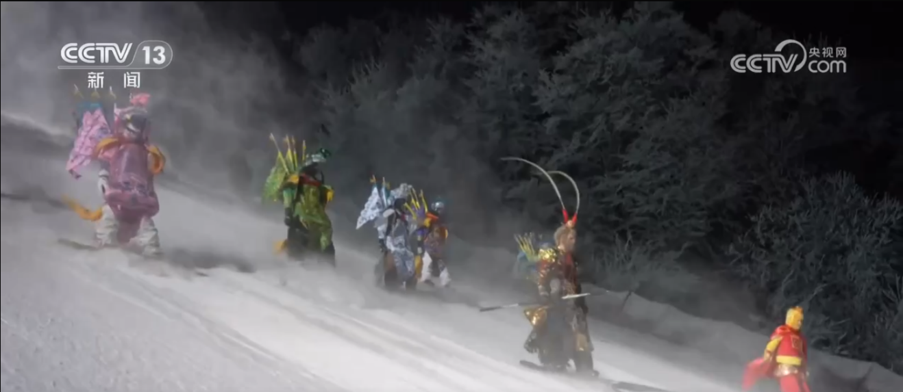 夜晚的雪場,浪漫不僅來自粉雪和星空。滑雪愛好者在雪道上馳騁的同時,身着京劇、川劇服飾的滑雪俱樂部成員也在雪場上帶來融合傳統文化與滑雪技巧的表演,展示出別具特色的雪上風采。