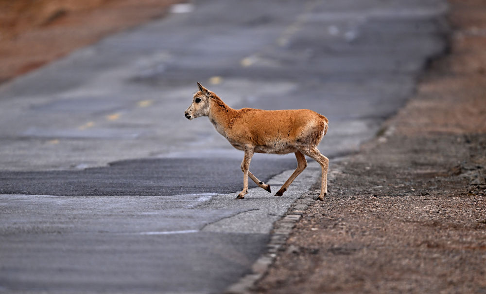 在可可西里,一隻雌性待產藏羚羊通過青藏公路(2023年5月28日攝)。新華社記者 張宏祥 攝